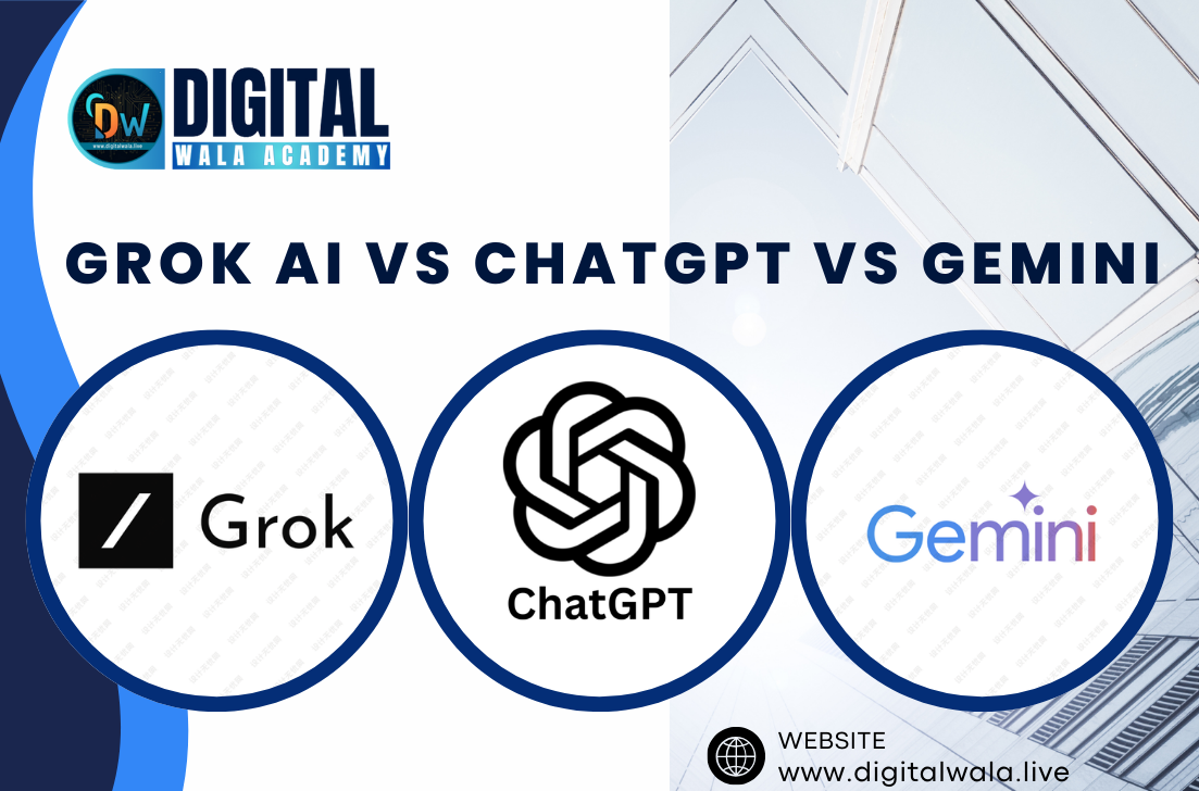 Artificial Intelligence has completely transformed the way digital marketing works in 2025. From automated content creation and SEO analysis to social media management, ad copywriting, and performance marketing, AI tools are now essential for marketers who want to stay competitive. Among the top AI platforms dominating the industry today, three names stand out — Grok AI, ChatGPT, and Gemini.This detailed comparison by Digital Wala AI Academy will answer the most searched question:“Grok AI vs ChatGPT vs Gemini: Which One Should Marketers Use?”